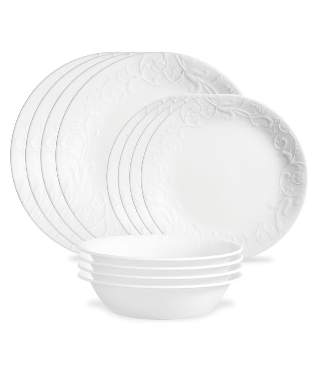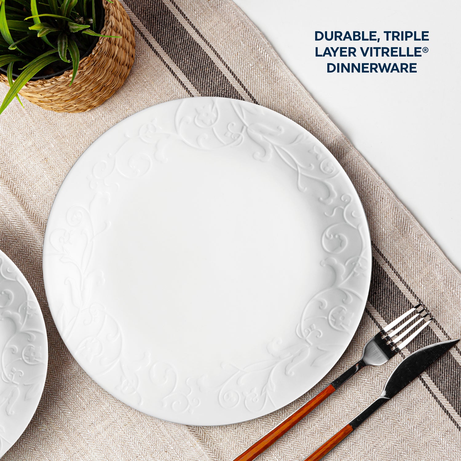 Elevate your table with the graceful beauty of Corelle® Bella Faenza. Featuring embossed, scroll-inspired detailing, this elegant white design adds a touch of sophistication to everyday meals and special occasions alike.