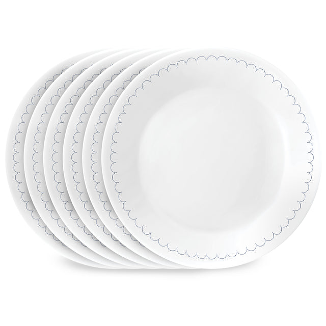 Crisp cottage textiles with delicate scalloped trim brings a gentle charm to this appetizer plate. Dishes in clean white with navy detailing feel airy and relaxed, and the perfect color palette for any setting.
